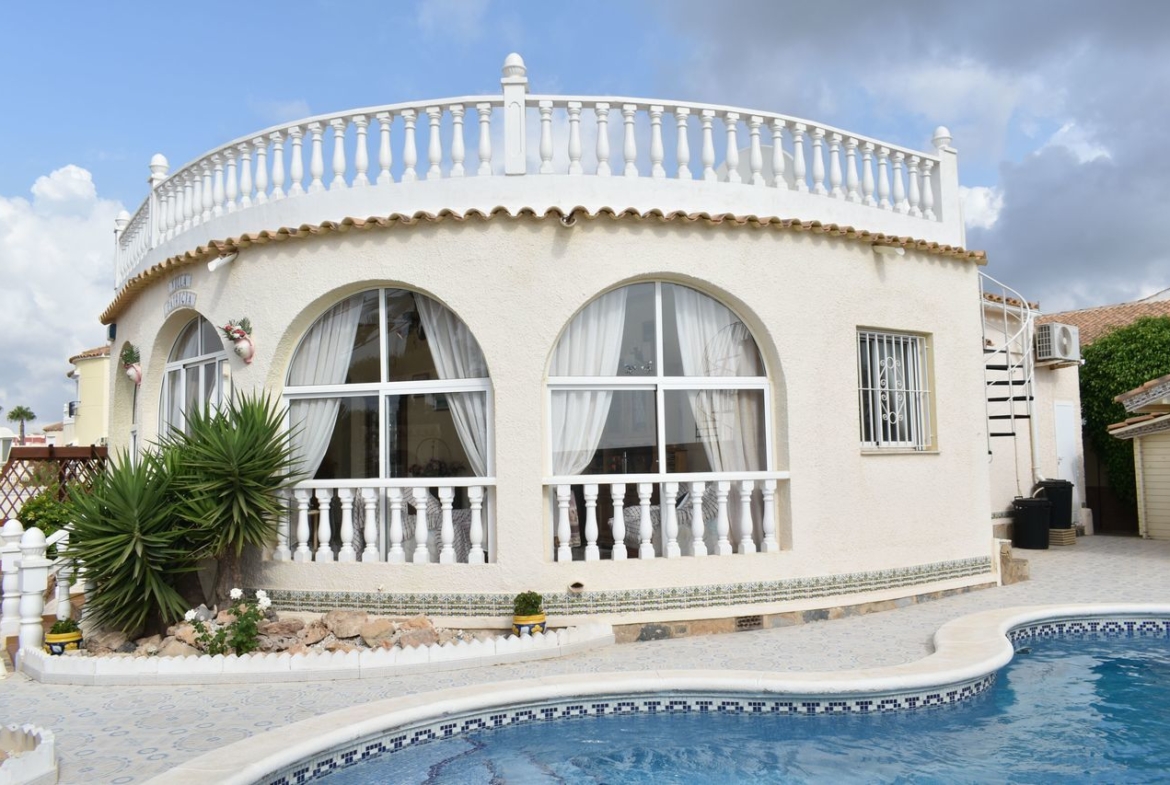 Beautiful South facing villa for sale with elevated views towards the Mediterranean sea. Located in El Presidente, Villamartin this property sits on a 420m2 plot boasting a saltwater swimming pool, summer kitchen and bbq area, numerous dining and seating areas along with a solarium. The property is accessed via the conservatory which has pretty views across the garden and swimming pool. There is a large living room, independent and fully equipped kitchen which leads into a separate utility and storage room. There is the master bedroom and en-suite bathroom, a family bathroom and 2 more bedrooms. Outside, overlooking the pool is a wooden annex and guest room with an extra bedroom and bathroom. There is a garage providing secure off road parking along with a tool shed. This villa is sold fully furnished with many extras including heated swimming pool, new kitchen appliances, air-conditioning and even a car!