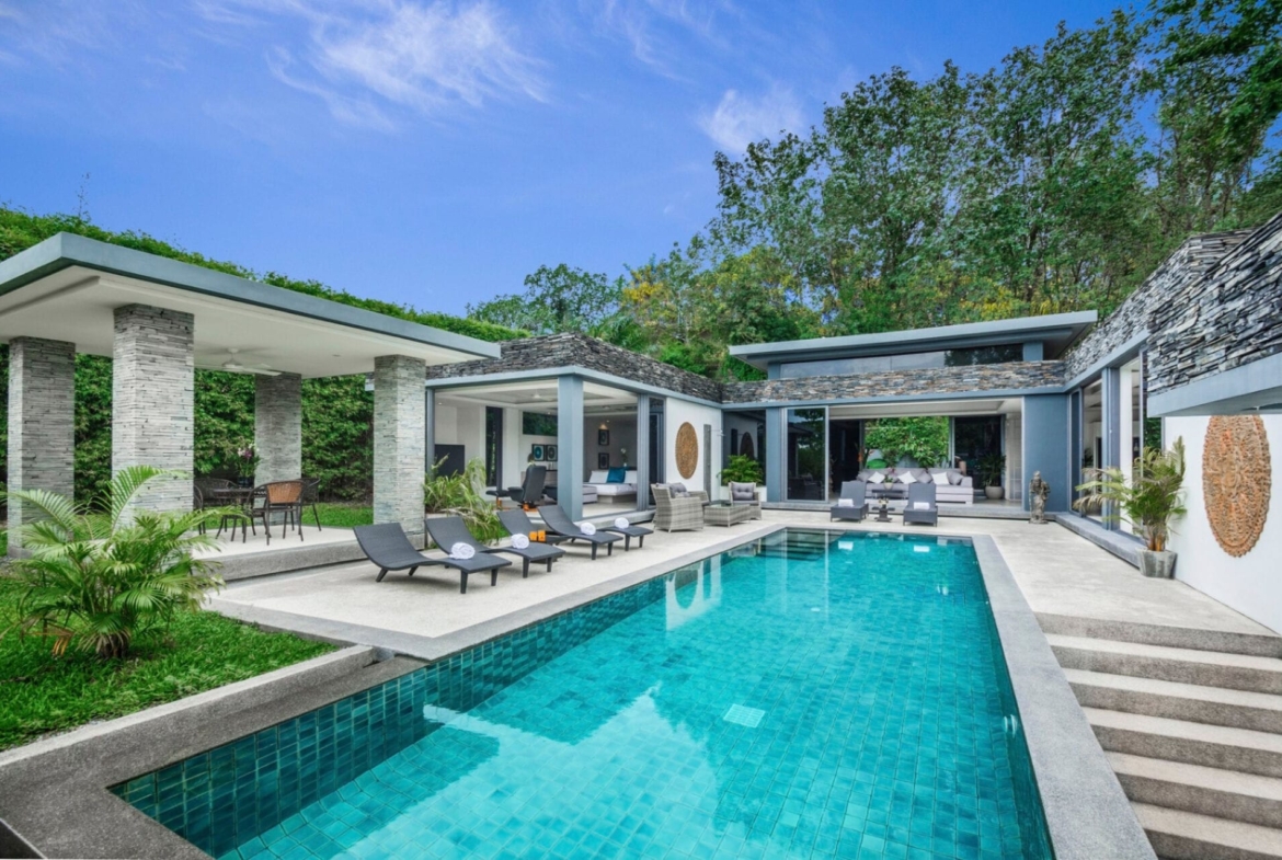 Situated in a secluded fruit orchard, surrounded by clusters of towering bamboo, the Villas by the Big Bamboo is a private and secure community dedicated to those individuals who have decided to commit to a convenient inland residence. Built to the same exact standards as the successful Villas Overlooking Layan development, these homes have well-appointed interiors, infinity pools and a long lasting build quality from the developer’s 25 years+ experience building on Phuket. This central location is perfectly suited for the Phuket lifestyle; world-class beaches within 10 minutes, shopping, with world-class golf courses and yacht marinas within easy reach …. Simple and easy, non-traffic routes to the international schools and only 20 mins from Phuket international airport. The villas are a contemporary design classic; featuring clean lines and bold statements of grey, black & white, all highlighted by the developer’s signature stacked slate accents, contrasted beautifully by the lush tropical surroundings. The developer has taken great care in selecting quality locally-sourced materials that weather naturally to minimize any ongoing maintenance costs.’ Spacious and functional layouts offer generous rooms with over height ceilings, well-appointed bathrooms and beautiful fully equipped kitchens. Creature comforts include fully integral air conditioning, ceiling fans, full height sliding aluminum door and window systems as well as skylights for extra natural light. Space is assured in all the villa options at the estate; from 3-bedroom pool villas with 382 sqm of developed area, all the way up to 5-bedroom pool villas with over 550 sqm of developed space. The villas are surrounded by tropical gardens and lawns, whilst a traditional Thai Sala is provided to offer shade from the sun. There is covered parking for two cars and additional driveway space for a further two cars at all of the villas. Construction is well underway, with a completed 4-bedroom single level villa, plus tw0 3-bedroom pool villas all ready to move in. The Villas by the Big Bamboo offers a variety of freehold and leasehold ownership structures to accommodate any buyer’s needs. Should you be in the market for a competitively priced, quality residence on Phuket, the Villas by the Big Bamboo is definitely worth a visit. The villa shown is a 4-bedroom single level property of 575 sqm of built area, occupying a 1,200 sqm chanote land plot. The sales price is 35M Thai Baht. There are also two 5-bedroom villas nearing completion available for 30M THB.
