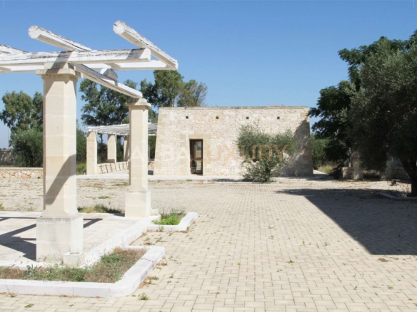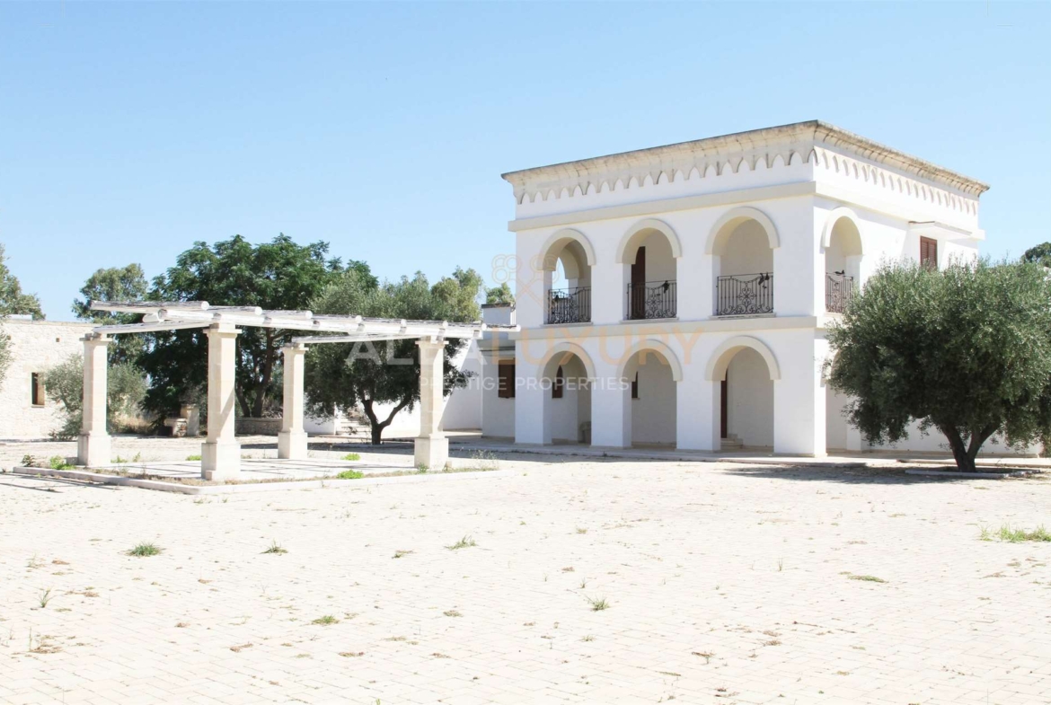 A marvellous estate just 5 km from the capital of Salento, it covers an area of 32,000 square metres, with living and recreational facilities perfectly integrated into the rural context of the masseria.^^In total there are^- 22 rooms^- 8 bedrooms^- 8 bathrooms^- 5 kitchenettes^- 1 kitchen garden^- 1 swimming pool^^The estate is composed as follows:^^The central body:^Developed on two floors, the main body houses 4 residential units and other service rooms.^On the ground floor there is a bedroom, internally equipped with a spacious bathroom, and the master bedroom, equipped with a large bathroom and walk-in wardrobe. Complementing the bedrooms, the accessory rooms on the ground floor include the eat-in kitchen, built entirely of masonry, with compartments and built-in appliances cleverly set into the design of the stone and wood used for the surfaces. From here, there is also access to the dining room and the large central hall, excellent spaces to be used as common areas for recreational and reception activities. Finally, the living room overlooks the rear courtyard, completely surrounded by perimeter walls and enriched by a portico with wooden beams: the roof is prepared for the installation of photovoltaic panels, useful for guaranteeing the structure a form of energy self-sufficiency.^Last but not least, the pluses are represented by an additional independent bathroom, laundry area and large storage room.^Outside, two staircases lead to the upper floor and the two flats. These, perfectly in line with the building’s construction style, have a bedroom, a bathroom, an equipped kitchenette and an independent terrace.^^Body towers:^Located at the opposite point from the main building, the tower body sees two autonomous residential units flanked, each equipped with a spacious bedroom, a bathroom and a kitchenette.^The towers, located on both sides and finely crafted in stone, are characterised by arches that, according to desire and need, can be closed with a system of glass covers. On the outside, too, there is provision for an equipped kitchenette.^^The annexes:^Respectively to the east and west of the main courtyard, the annexes house a large bedroom, a kitchenette and a comfortable bathroom.^Externally, on the other hand, the semi-perimeter gazebo proves to be a versatile hallway that lends itself as a kitchenette and parking space, thus avoiding prolonged exposure to the sun.^A little to the west of the main block, slightly secluded, the swimming pool is the ideal place to enjoy the long, hot summer days.^Surrounding the infinity edge are no less than four large masonry gazebos which, thanks to their wooden beam roofing, form a perfect relaxation area. The one located on the east side also houses the maintenance room from which the water circulation and purification systems can be accessed.^In the immediate vicinity of the steps leading to the pool, a dry stone wall delimits the area equipped with showers and foot-washing fountains for pre- and post-bathing cleansing.^Thus boasting a swimming pool no less than 25 metres long, Tenuta Castelvetri fully falls into the category of farms with a semi-Olympic swimming pool.The estate aims to re-propose the stylistic icons that characterise the Salento interior: the layout of the manor house, for example, recalls that of the ancient fortified farms, just as the towers of the residential units evoke the outposts scattered along the coastline and the annexes recall the pajaro, the typical rural construction made using the dry-stone wall technique. The large inner courtyard is adorned by a pergola made of stone and wooden planks that, in its shape, position and functionality, recalls the architecture of Baroque interior cloisters and offers a shaded area under which to admire the surrounding landscape.^In perfect alignment with the original vocation of this type of construction, an area for cultivation has been set up behind the central unit: bordered by a small dry-stone wall, the vegetable garden is equipped with services (including access to water and a composting tank) useful for the activity, thus enabling the structure’s needs to be met.^Moreover, the perimeter walls are dotted with small fountains that, every 10 metres, guarantee practical access to running and absolutely drinkable water; as dusk falls, moreover, everything is lit up with new light thanks to the lighting system incorporated in the dry stone walls.^Finally, two very important services are the equipment of a completely buried LPG tank and a UV water sanitisation system that guarantees perfect drinking water and completely safe use. Salento is located in the southern part of Apulia and its easternmost point coincides with Capo d’Otranto, the point where the waters of the Ionian Sea and the Adriatic Sea come together. This is an enchanting land that will surely surprise you with its marvellous landscapes, its white beaches characterised by the so-called ‘dunes’, and its numerous breathtaking cliffs, full of caves, overlooking a crystal-clear sea. ^^,
